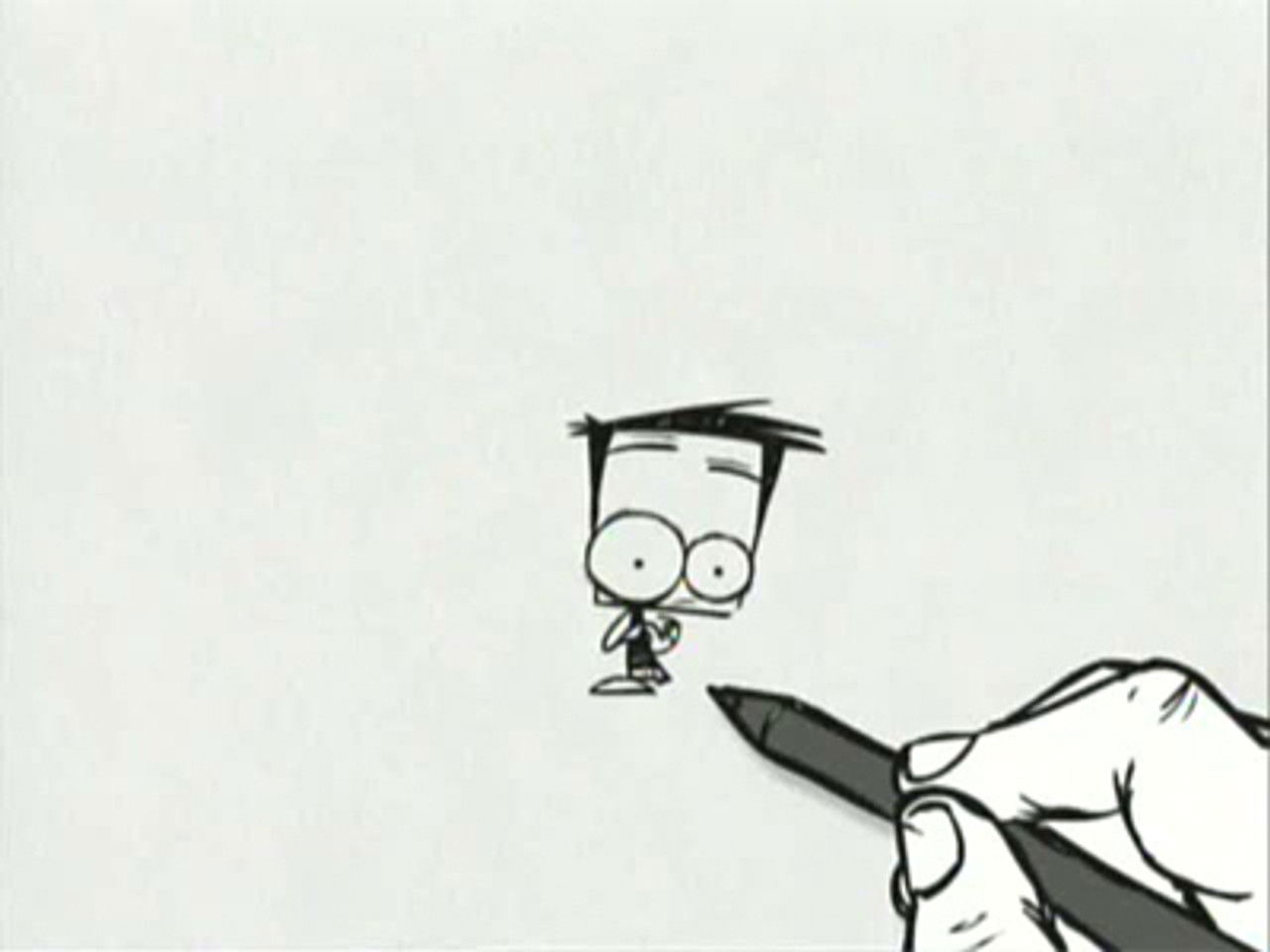 In this pilot episode, we discover the relationship between Dood and the Hand (Adam and the Creator if you will). Hand enters and draws Dood. With the final dots of the eyes, Dood comes to life. Excited by his new life he celebrates with a little dance but soon discovers the “playful” nature of his creator when he realizes he’s miles from the ground. Dood plummets towards the earth, landing on a telephone line, which splits him in two. The two halves pop into two wholes and the Dr. Jekyll and Mr. Hyde adventure begins…