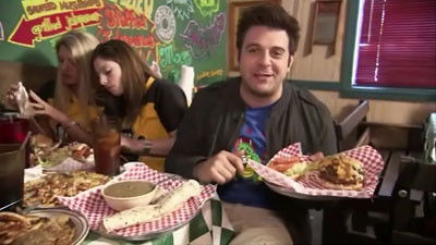 Adam tackles a T-bone steak during a trip to Oklahoma. He also downs a spicy burger in Amarillo, Texas, and indulges in Coney dogs in Detroit.